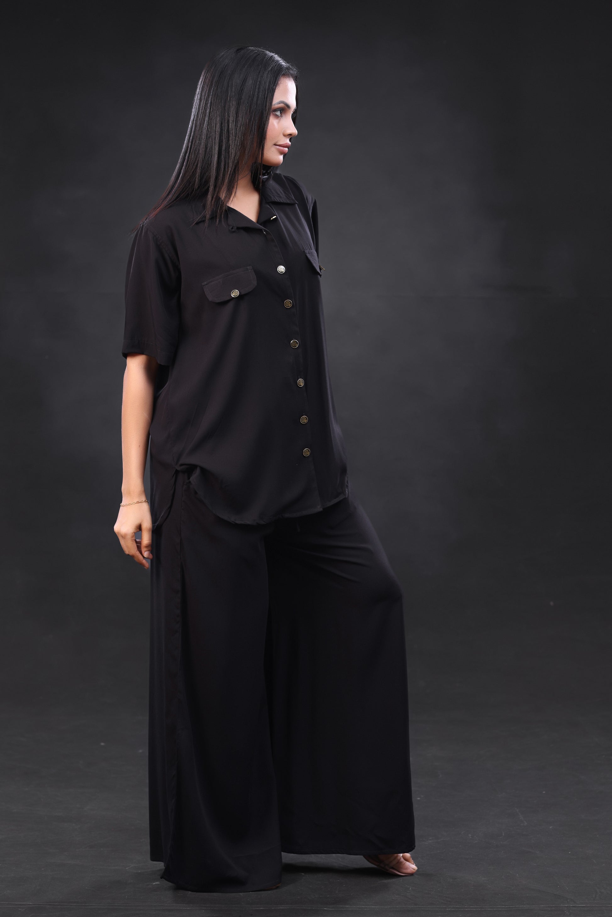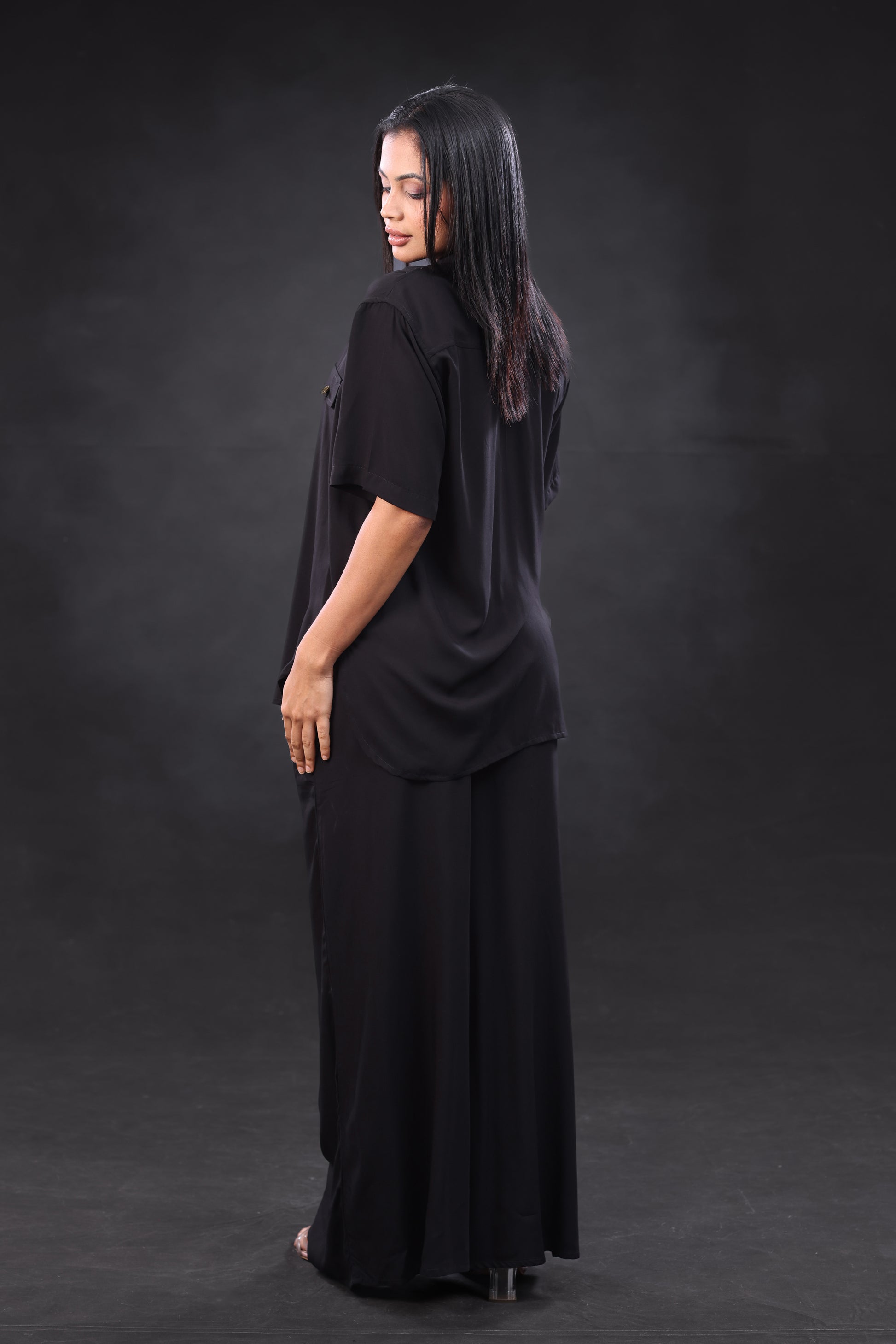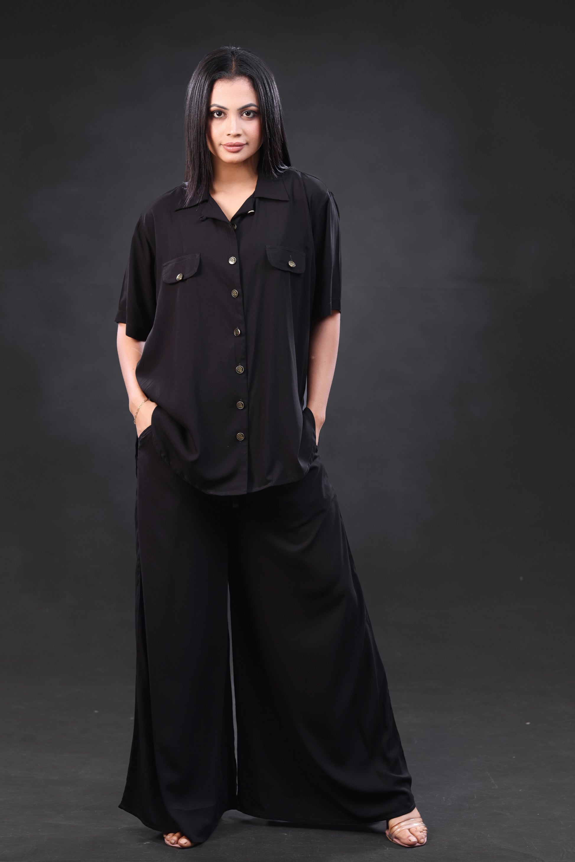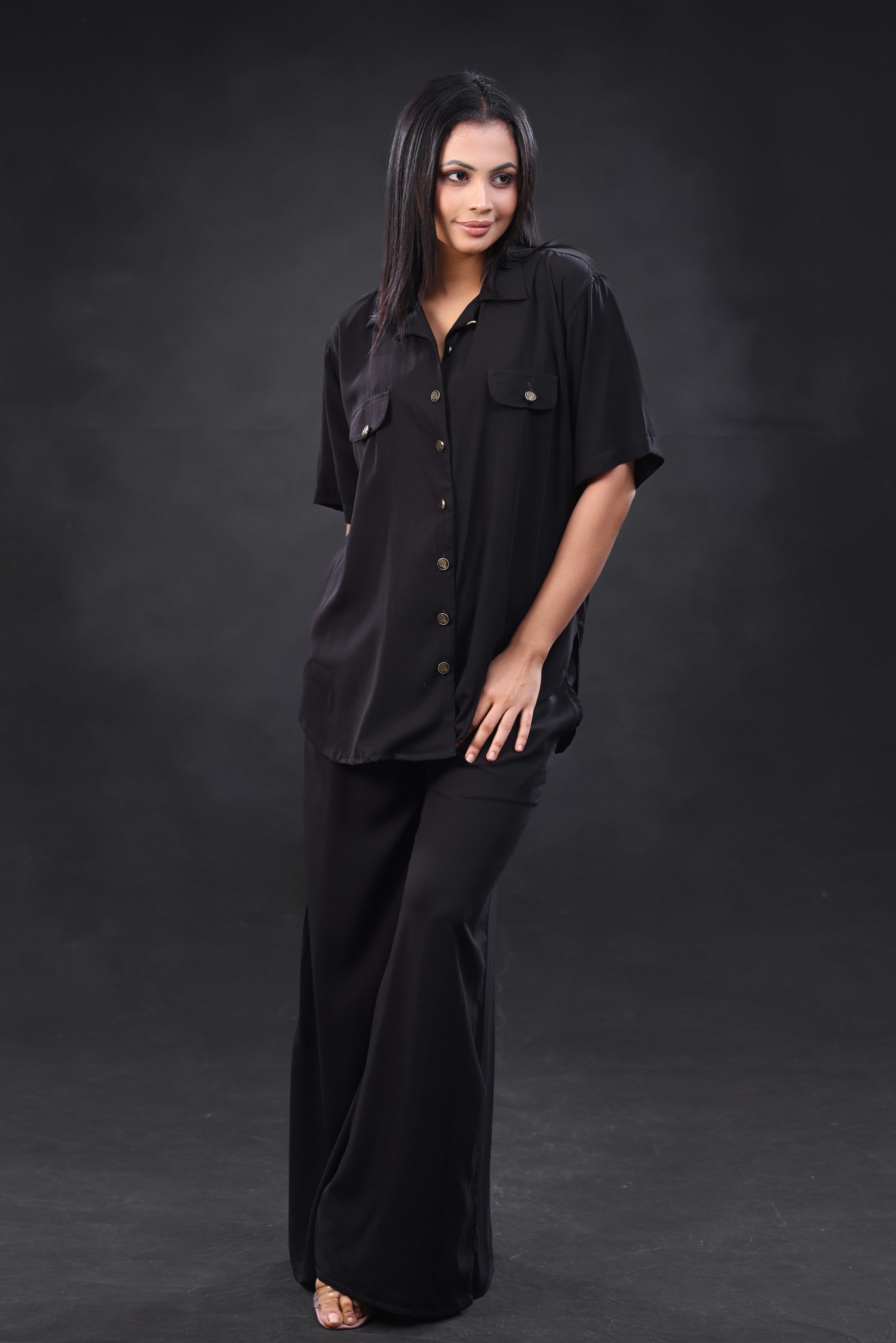 Crafted from high-quality viscose with a soft, luxurious touch, this black two-piece set redefines versatile style. The relaxed button-down top features polished gold buttons and flap pockets, adding a subtle yet sophisticated detail. Paired with wide-leg pants, this set offers a flattering silhouette that effortlessly blends comfort and elegance.
