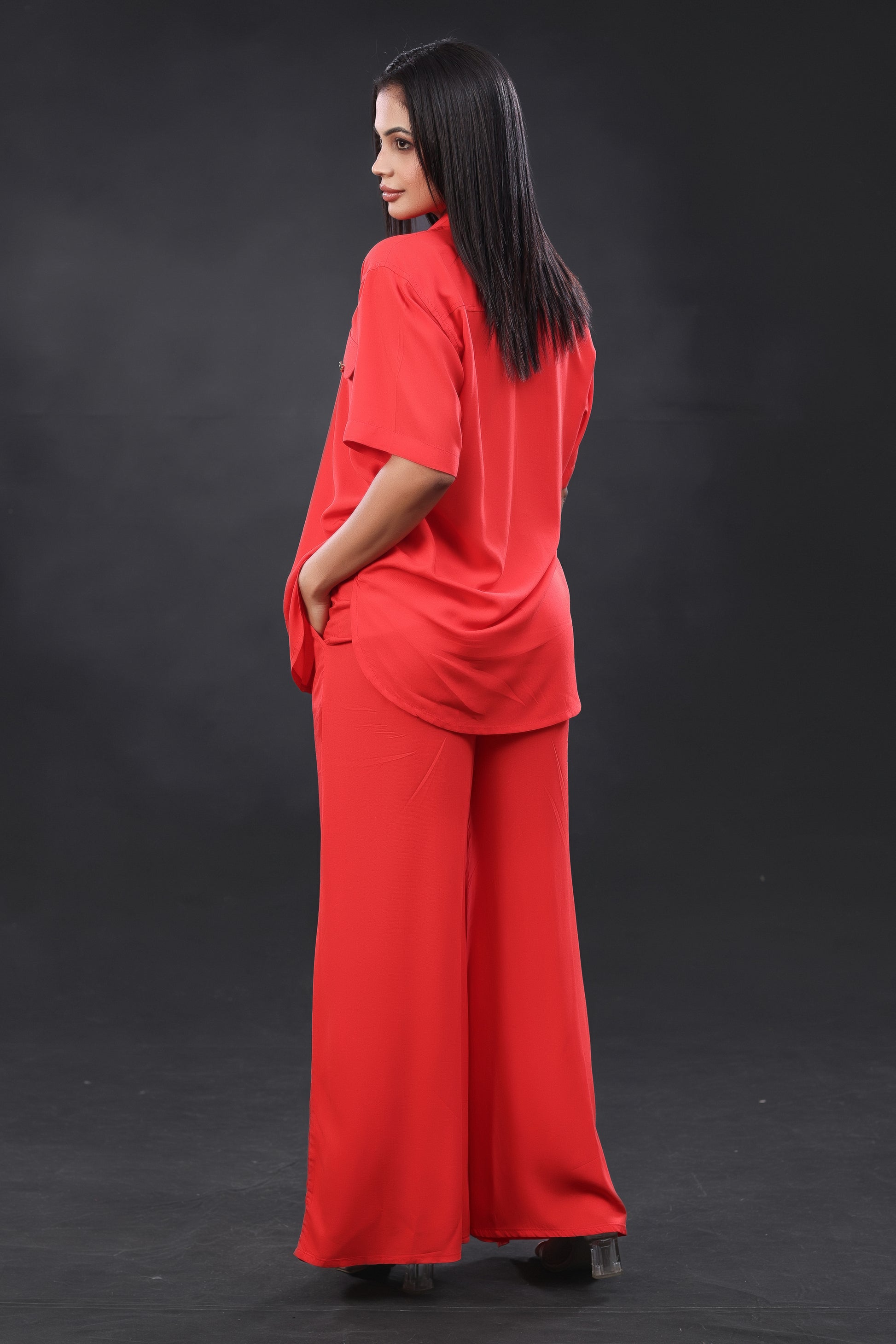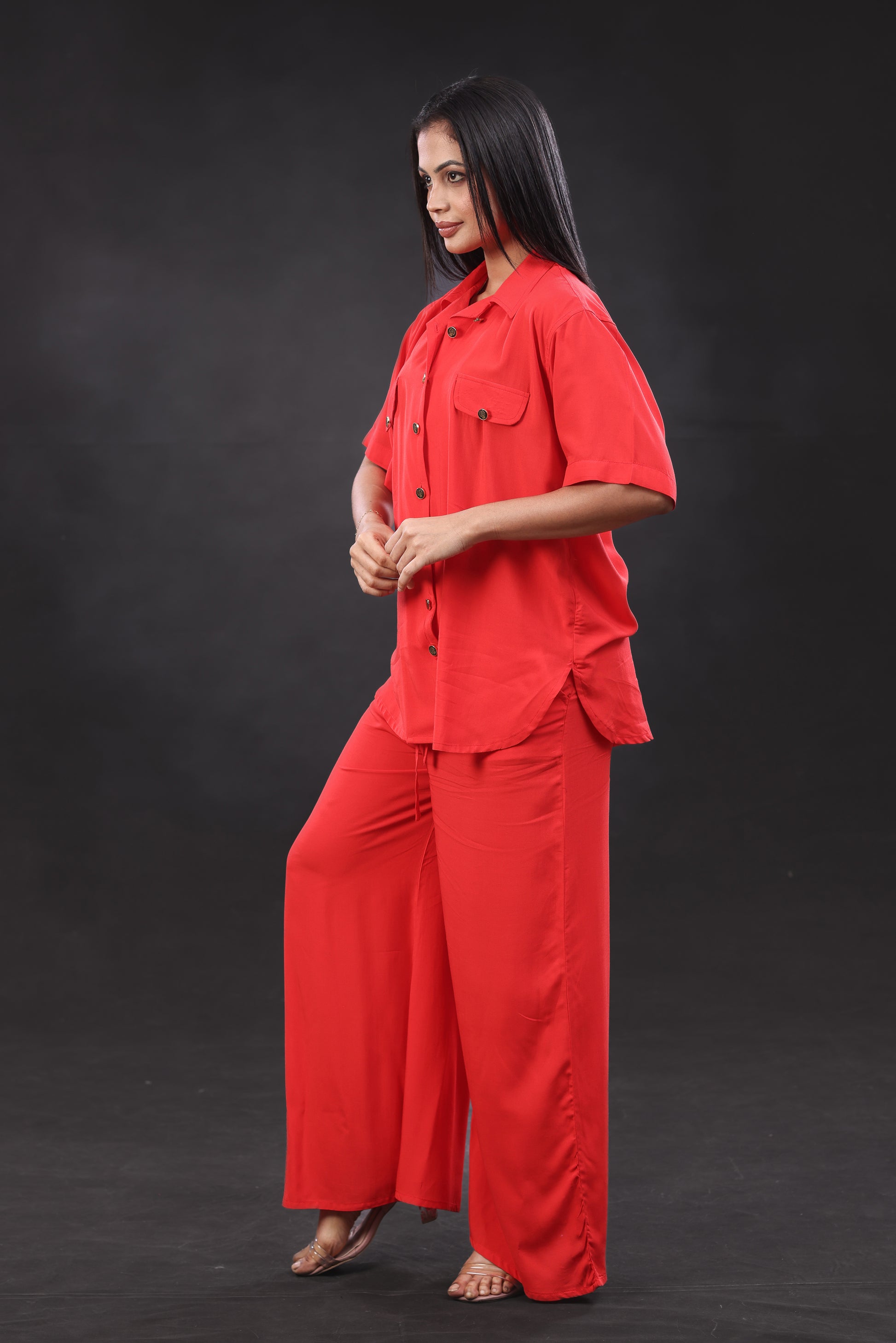 Crafted from high-quality viscose with a soft, luxurious touch, this black two-piece set redefines versatile style. The relaxed button-down top features polished gold buttons and flap pockets, adding a subtle yet sophisticated detail. Paired with wide-leg pants, this set offers a flattering silhouette that effortlessly blends comfort and elegance.