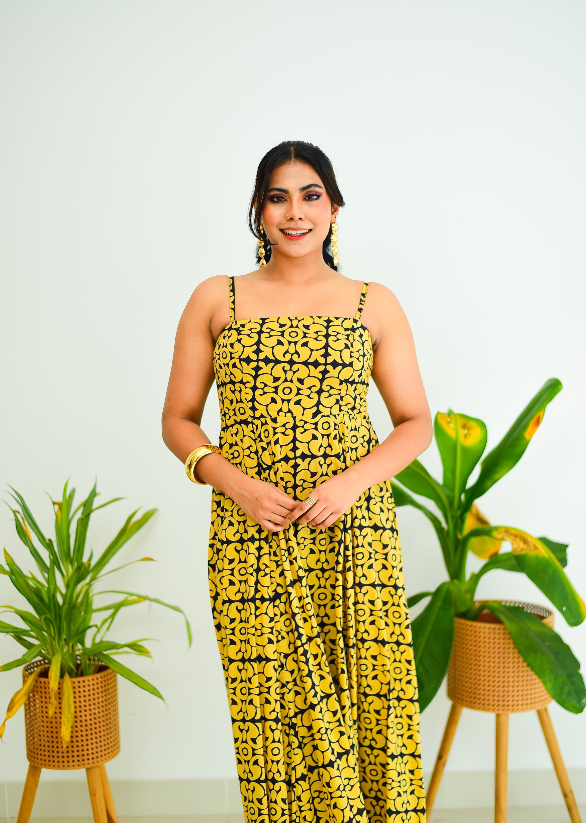 Expertly crafted with a back smoked design and adjustable straps, our Strap Block Printed Maxi Dress offers versatile comfort and effortless style. With a dress length of 54 inches, this dress is the perfect addition to your wardrobe for any occasion.